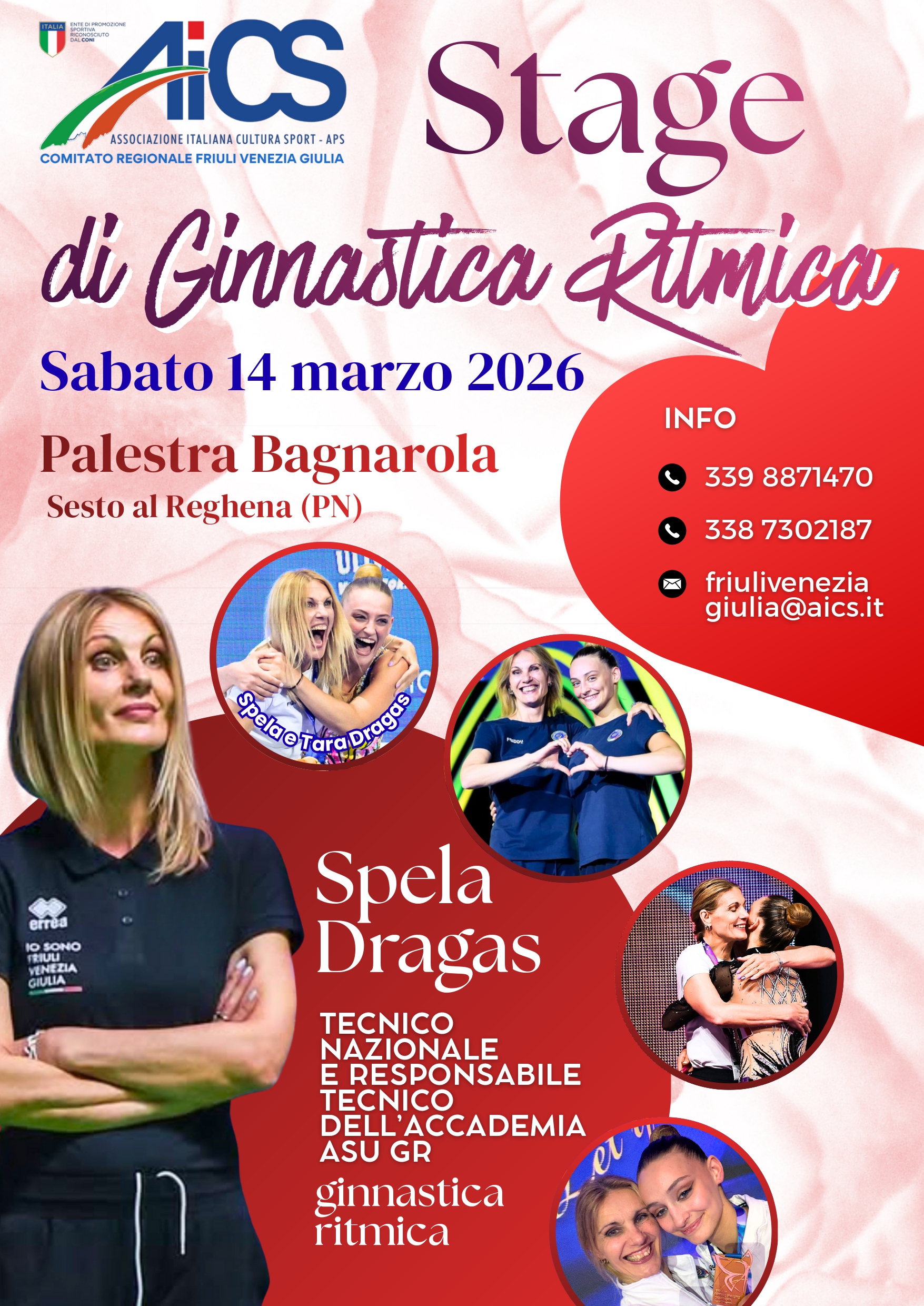 Lo stage è rivolto alle ginnaste tesserate e non tesserate AiCS di categoria PROMO (tutti i livelli), SILVER (tutti i livelli) e GOLD, e si configura inoltre come corso di aggiornamento per istruttori e tecnici tesserati e non tesserati AiCS, con attestazione Regionale di partecipazione. A tenerlo sarà la Tecnica nazionale Spela Mohar Dragas, anche responsabile tecnico della sezione agonistica dell’accademia ASU GR: Spela sarà coaudiuvata nella realizzazione pratica dalle sue ginnaste.