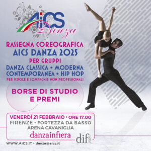 - nella giornata di venerdì 21 febbraio 2025 la “Rassegna Coreografica Nazionale a Premi AICS Danza 2025” ore 17:00/19:00 presso l’Arena Cavaniglia. La partecipazione sarà riservata a Scuole di danza classica, moderna e contemporanea e a compagnie non professionali (NOVITA’), di ogni metodo di studio, con una o più coreografie di massimo 4 minuti ed esclusivamente di GRUPPO da 3 componenti dagli 8 anni senza limiti di età e in possesso di certificato medico (consigliato agonistico).