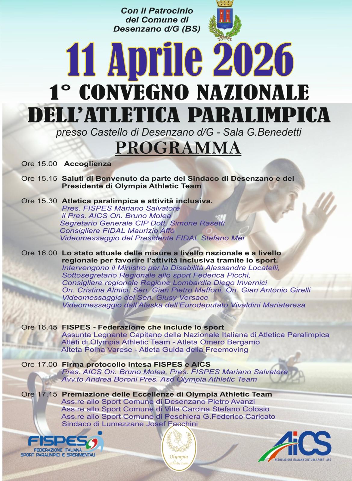 L’iniziativa, promossa con il patrocinio del Comune di Desenzano del Garda e con il coinvolgimento della società Olympia Athletic Team (guidata da Andrea Boroni, anche referente Disabilità di AiCS nazionale: nella foto con atleti e dirigenti dell’associazione) , vuole accendere i riflettori sull’atletica paralimpica non solo come ambito agonistico di grande valore, ma anche come spazio educativo, culturale e sociale capace di abbattere barriere e pregiudizi ancora troppo diffusi.