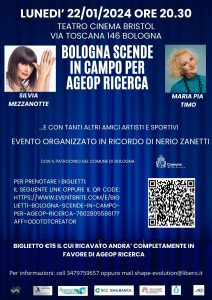 Appuntamento lunedì 22 gennaio alle 20.30 al teatro cinema Bristol con lo spettacolo teatrale per Ageop Ricerca: sul palco, Silvia Mezzanotte e Maria Pia Timo. Con loro, tanti artisti e sportivo in ricordo di Nerio Zanetti, grande allenatore che ha fatto la storia del volley di Bologna e non solo.