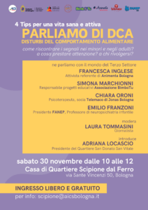 Alla Casa di Quartiere Scipione dal Ferro inizia una nuovo format: le tavole rotonde tematiche per promuovere il benessere psicofisico dei cittadini e delle cittadine. Il primo appuntamento sarà sabato 30 novembre alle 10 con l’incontro “Parliamo di DCA, disturbi del comportamento alimentare” in collaborazione con Animenta, Bimbo Tu e Telemaco di Jones. Con le professioniste e i professionisti Francesca Inglese, Simona Marchionni, Chiara Oroni ed Emilio Franzoni in dialogo con la giornalista Laura Tommasini affronteremo il tema dei disturbi del comportamento alimentare orientandolo alle famiglie con minori ma anche a giovani adulti e adulte. Il taglio dell’incontro sarà divulgativo e informativo, e l’argomento sarà trattato dal punto di vista del mondo del Terzo Settore e della rete associazionistica. Anche in questo caso, l’approccio multidisciplinare è ciò che caratterizza l’attività in modo innovativo: gli incontri ospiteranno diverse realtà di categoria del territorio, per declinare la promozione di corretti stili di vita in più sfaccettature.