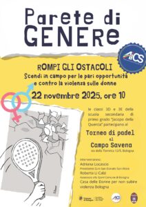 Anche Bologna aderisce a Parete di genere, il flash mob promosso dalla commissione nazionale parità di AiCS per promuovere l’impegno dello sport contro la violenza di genere alla vigilia della Giornata internazionale. Per l’occasione, le classi 3D e 3E della scuola secondaria di primo grado “Jacopo della Quercia” partecipano al Torneo di padel al Campo Savena. IN aggiunta, AiCS Bologna promuoverà anche il gioco speciale delle “flash cards” – card nate per far conoscere storia di donne che spesso, purtroppo, non hanno avuto il giusto riconoscimento storico.