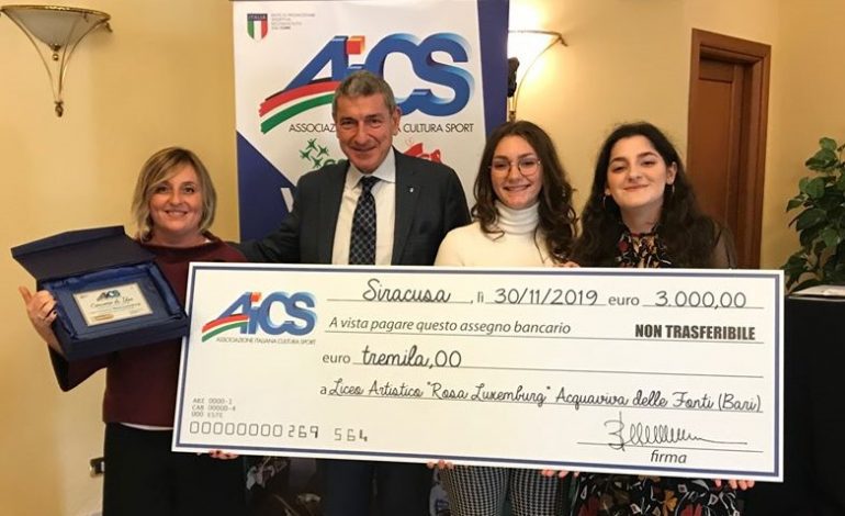 E’ stato il presidente di AiCS Bruno Molea, sabato 30 novembre a Siracusa nel corso della sesta assemblea nazionale AiCS, a consegnare la borsa di studio alle quattro studentesse del “Rosa Luxemburg” di Acquaviva delle Fonti (Bari), vincitrici del bando di concorso per l’ideazione del calendario 2020 dell’Associazione.Si tratta di Miriana Giammarrusti, Elena Giampetruzzi, Carlotta Palmisano, Raffaella Daniello della 4a A del Liceo artistico pugliese che – guidate dalla docente Arianna Ciccarone – hanno declinato famose opere d’arte, al cui interno hanno inserito elementi di sport o di promozione sociale. A ritirare il premio a Siracusa c’erano Miriana e Elena, accompagnate dalla professoressa Anna Sirressi.