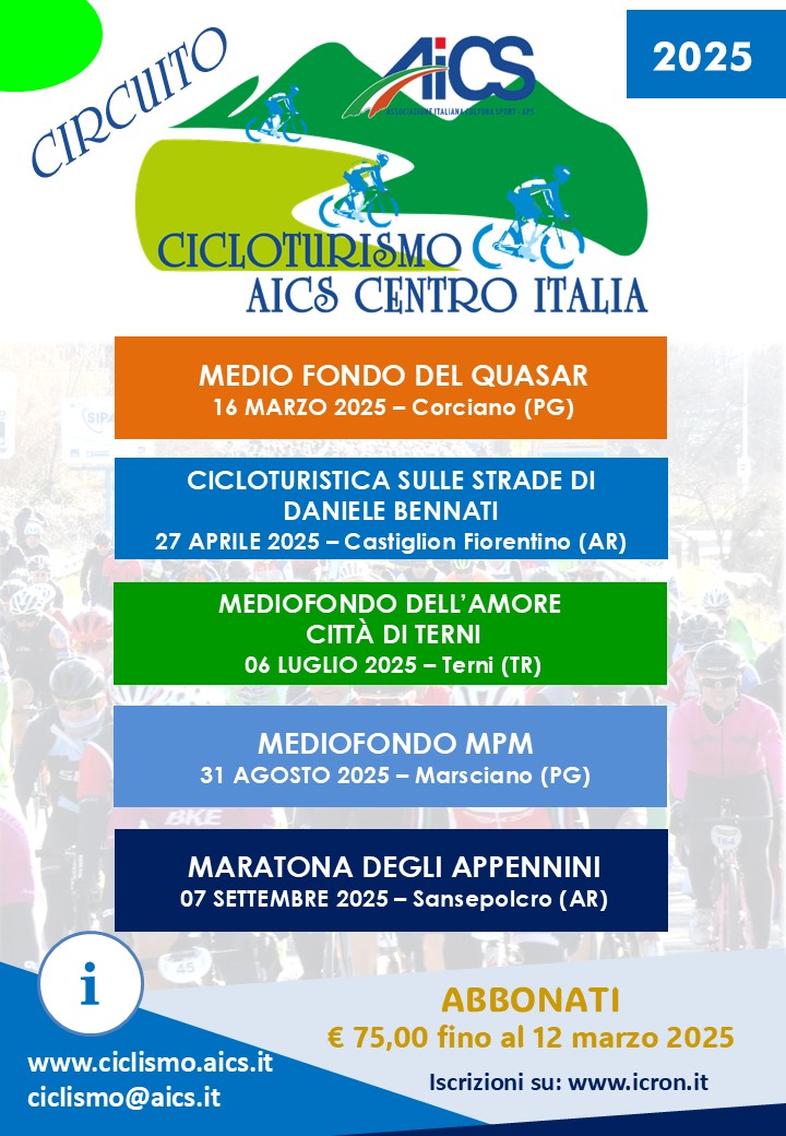 Sono cinque le manifestazioni cicloturistiche che compongono il circuito 2025 e si svolgono nei territori dell’Umbria e della Toscana sotto l’egida dell’Ente di promozione sportiva AiCS.