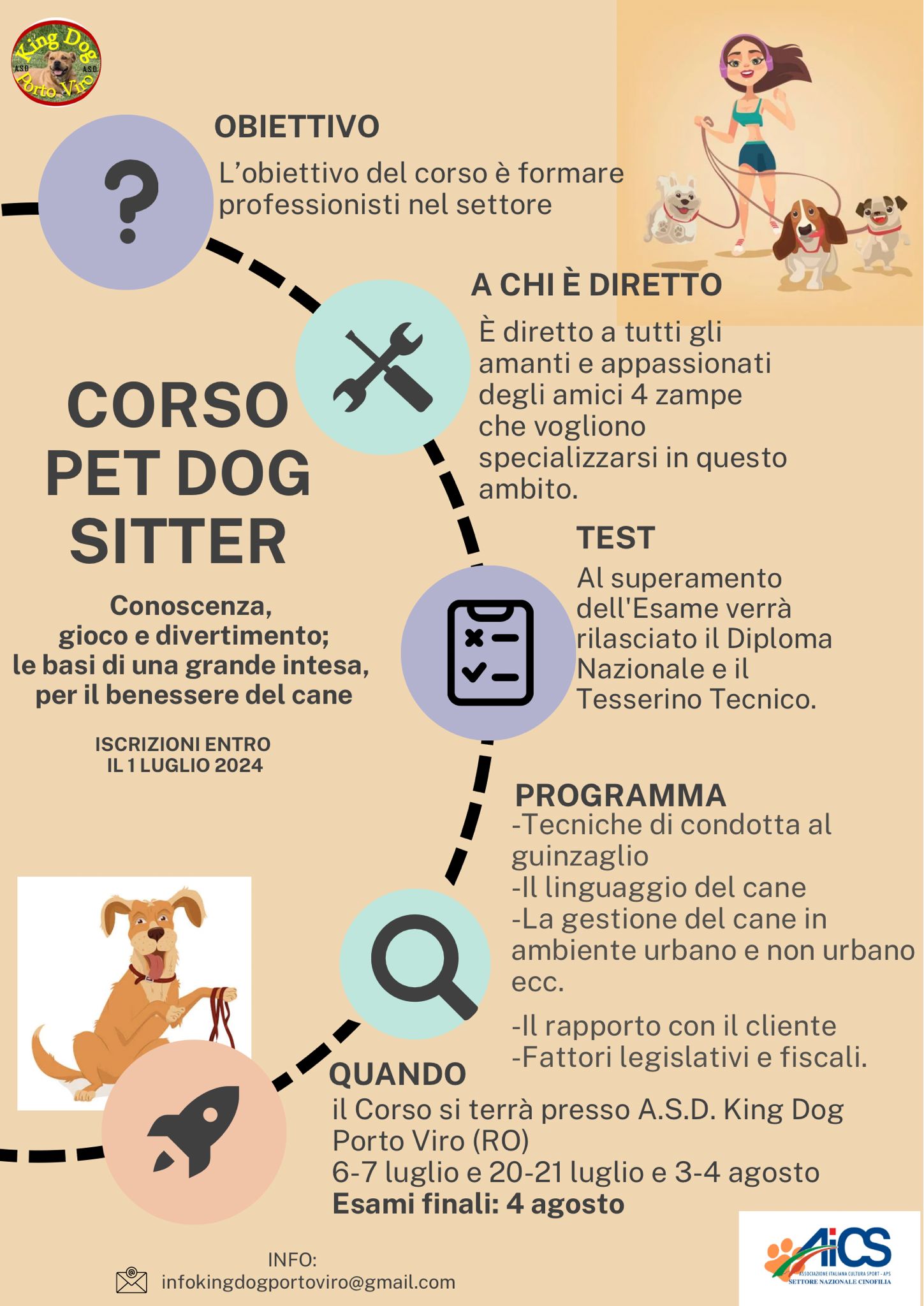 Il Corso si terrà presso A.S.D. King Dog Porto Viro (RO) via Strada Statale Romea 309; è formato da 48 ore di lezione e partirà il 6 luglio per terminare il 4 agosto. Tra le materie di studio: Presentazione e finalità dell’Ente, diversità tra Dog Sitter e Pet Sitter, linguaggio del cane, giusto approccio, socializzazione del cane e gestione del cane in ambiente urbano oltre che condotta al guinzaglio.