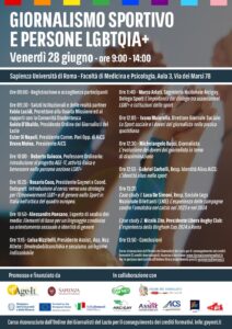 Di questo si tratterà nel corso di formazione per giornalisti dal titolo “Giornalismo sportivo e temi Lgbt+” – organizzato dall’Ordine dei giornalisti del Lazio, in collaborazione con AiCS e GayNet, e che si terrà il 28 giugno nell’aula magna del Dipartimento di Psicologia dell’Università La Sapienza.