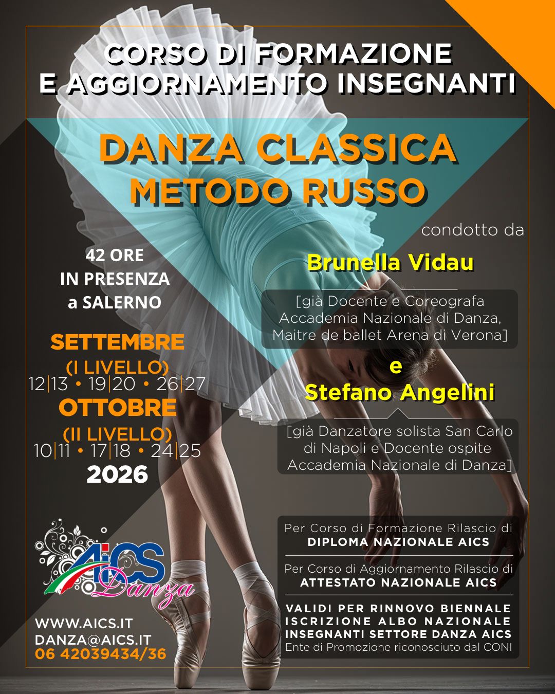 Un percorso di alta formazione dedicato agli insegnanti di danza classica e a chi desidera approfondire la tecnica accademica. AiCS promuove a Salerno il Corso di formazione e aggiornamento insegnanti di danza classica – metodo russo, un percorso di 42 ore in presenza in programma tra settembre e ottobre 2026.