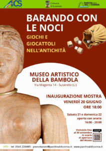 Inaugura venerdì 20 giugno alle 18 al Museo Artistico della Bambola di Suvereto “Barando con le noci – Giochi e giocattoli nell’antichità”, la mostra dedicata a illustrare il significato simbolico, culturale e sociale del gioco nel mondo antico, dall’infanzia all’età adulta, curata da Daniele Lamuraglia e Elisa Laschi, del Dipartimento Cultura di AiCS, e organizzata in collaborazione con Parchi Val di Cornia e Comune di Suvereto.