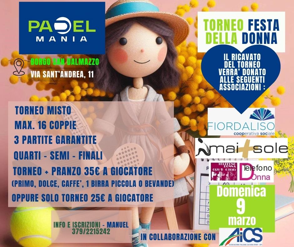 In occasione della Giornata internazionale della donna, per domenica 9 marzo, AiCS Cuneo organizza un torneo di Padel che si svolgerà presso il nuovo centro Padel in Borgo San Dalmazzo (CN). Il ricavato del torneo sarà devoluto in beneficenza alle 3 associazioni che operano nella lotta alla violenza di genere: MAI PIU SOLE , COOP FIORDALISO e TELEFONO DONNA.