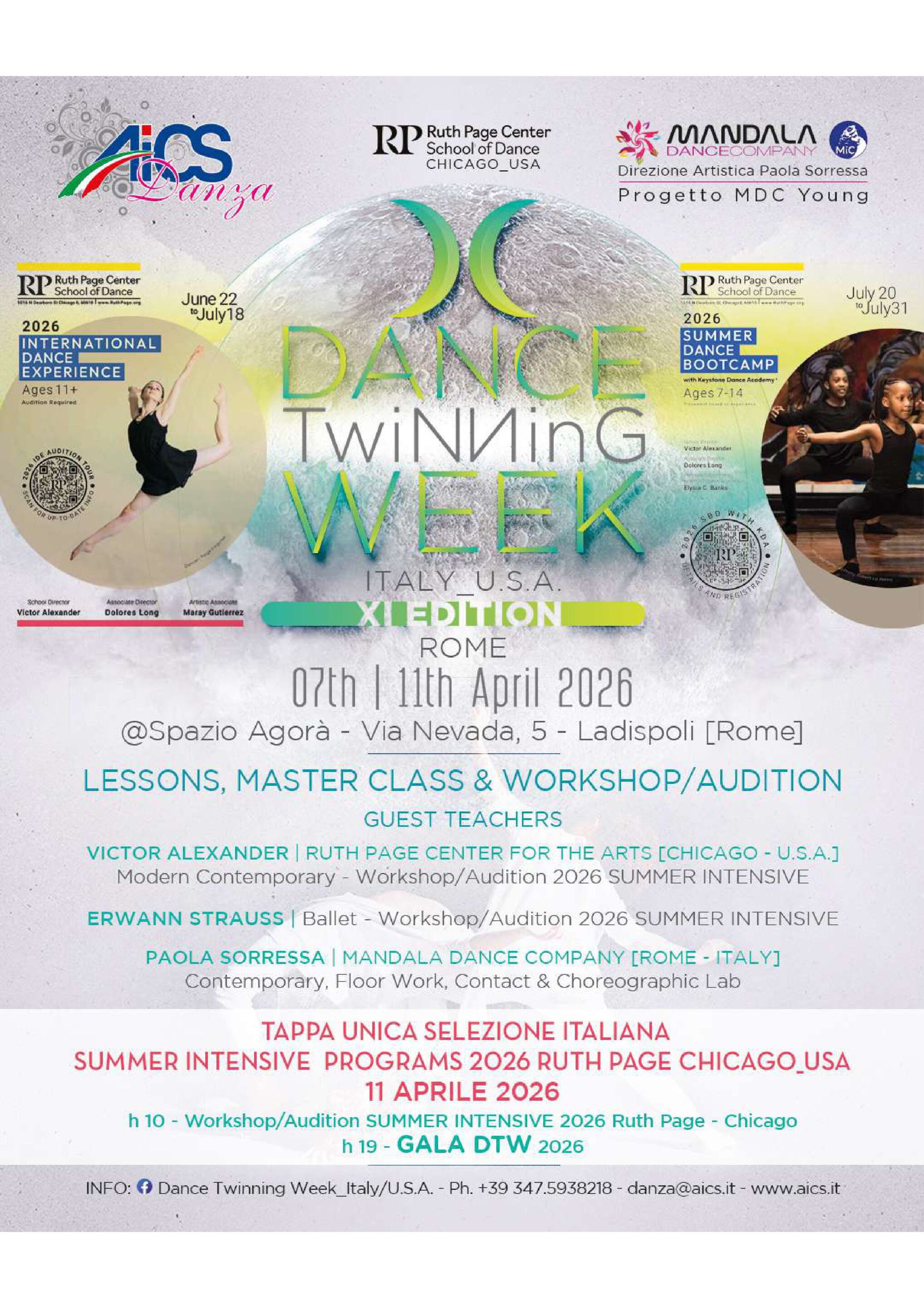 Evento ponte internazionale, visto come momento di sano confronto e scambio tra allievi di scuole di danza italiane e straniere, si concluderà sabato 11 aprile con il Workshop Audition (lezione di danza classica con maestri ospiti e modern/contemporaneo con il Direttore di Ruth Page Victor Alexander) e Galà a Premi (esibizioni delle Scuole di danza partecipanti italiane e straniere), validi per la selezione come tappa unica italiana per il Summer Intensive di Ruth Page Center for the Arts Chicago_USA (saranno assegnate Borse di studio integrali e/o parziali per l’estate 2026).