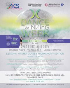 Promosso da AiCS Danza, torna a Ladispoli (Roma) la Dance Twinning Week Italia-Usa: stage, audizioni e workshop dedicati alla danza e che vedranno insieme per 5 giorni allievi delle scuole di danza italiane e straniere.