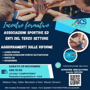 Per questo, il comitato provinciale Forlì-Cesena di AiCS – Associazione italiana cultura sport promuove un seminario gratuito, rivolto prima di tutto a tutte le sue associazioni affiliate, ma anche aperto al pubblico fino ad esaurimento posti. Il seminario si terrà sabato 30 novembre alle 10 nella sala Campostrino (in piazzetta Campostrino 4 a Forlì). Relatori saranno gli esperti di fiscalità per il Terzo settore sportivo e sociale: il ragioniere Valter Bartoletti, e il commercialista Alessio Silvestri, consulente di AiCS nazionale. I saluti iniziali saranno affidati alla presidente di AiCS Forlì-Cesena, Catia Gambadori.