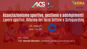 Prosegue il percorso di formazione gratuita per gli affiliati AiCS. Grazie al progetto E’ Ora! Servizi di aggiornamento e assistenza all’associazionismo sportivo per la ripartenza, AiCS direzione nazionale promuove il webinar informativo su Riforma dello sport, Riforma del Terzo Settore e Safeguarding: l’appuntamento è mercoledì 26 marzo dalle 16 alle 18, on line.