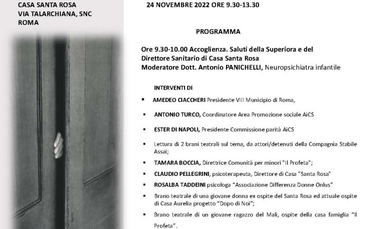 Modererà i lavori il dottor Antonio Panichelli, neuropsichiatra infantile: al centro, le storie di una donna ex ospite della casa famiglia e di un giovane del Mali, ospite oggi della comunità il Profeta. Interverranno anche: Amedeo Ciaccheri, presidente dell’VIII municipio di Roma; Antonio Turco, coordinatore dell’Area di promozione sociale di AiCS; Ester di Napoli, presidente della commissione di parità di AiCS; Tamara Boccia, direttrice della comunità “Il profeta”; Claudio Pellegrini, psicoterapeuta e direttore della Casa Santa Rosa; Rosalba Taddeini, psicologa dell’associazione Differenze Donne Onlus; Giacomo Ebner, magistrato e presidente della commissione educazione e formazione alla legalità dell’associazione nazionale magistrati. Conclude i lavori il presidente AiCS Bruno Molea.
