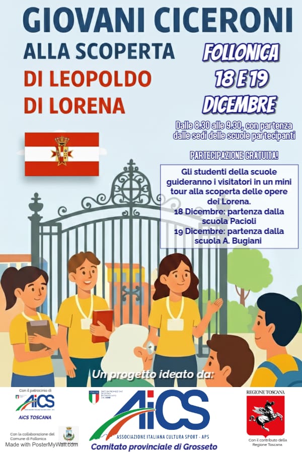 A Follonica, gli studenti diventano “Giovani Ciceroni” alla scoperta del Palazzo Granducale e della storia di Leopoldo di Lorena, un’iniziativa promossa dal Comitato Provinciale AiCS di Grosseto e finanziata dalla Regione Toscana e con il patrocinio di AICS Toscana in occasione dei 260 anni dall’insediamento di Pietro Leopoldo di Lorena come Granduca di Toscana.