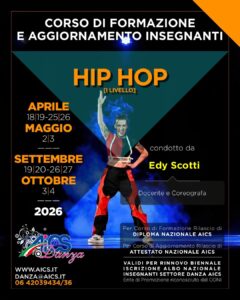 Il corso sarà condotto da Edy Scotti, docente e coreografa, e rappresenta un’importante occasione di crescita professionale per insegnanti, danzatori e operatori sportivi che vogliono approfondire metodologie di insegnamento, tecnica e linguaggio coreografico dell’hip hop.