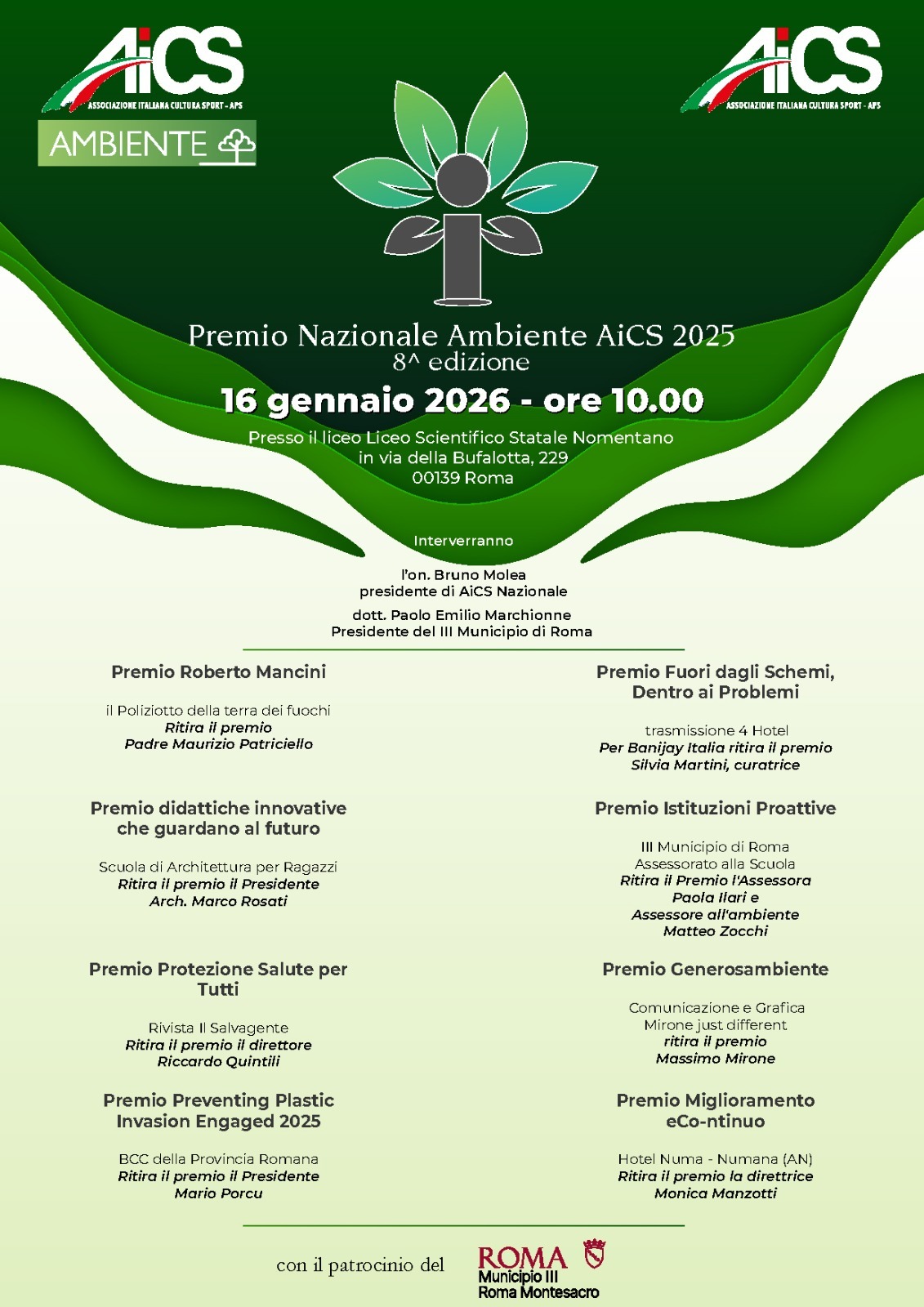 I lavori saranno aperti dal presidente di AiCS Bruno Molea , vedranno il saluto di Paolo Emilio Marchionne, presidente del 3° Municipio di Roma e saranno condotti da Andrea Nesi, coordinatore di AiCS Ambiente. Il premio – diviso in “Premio Roberto Mancini”, premio Didattiche innovative; premio Protezione salute per tutti; Premio Preventing Plastic Invasion; Premio “Fuori dagli schemi, dentro ai problemi”; premio “Istituzioni proattive”, premio “Generosambiente” e premio “Miglioramento eCo-ntinuo” – sarà consegnato di fronte a studentesse e studenti del Liceo Nomentano.