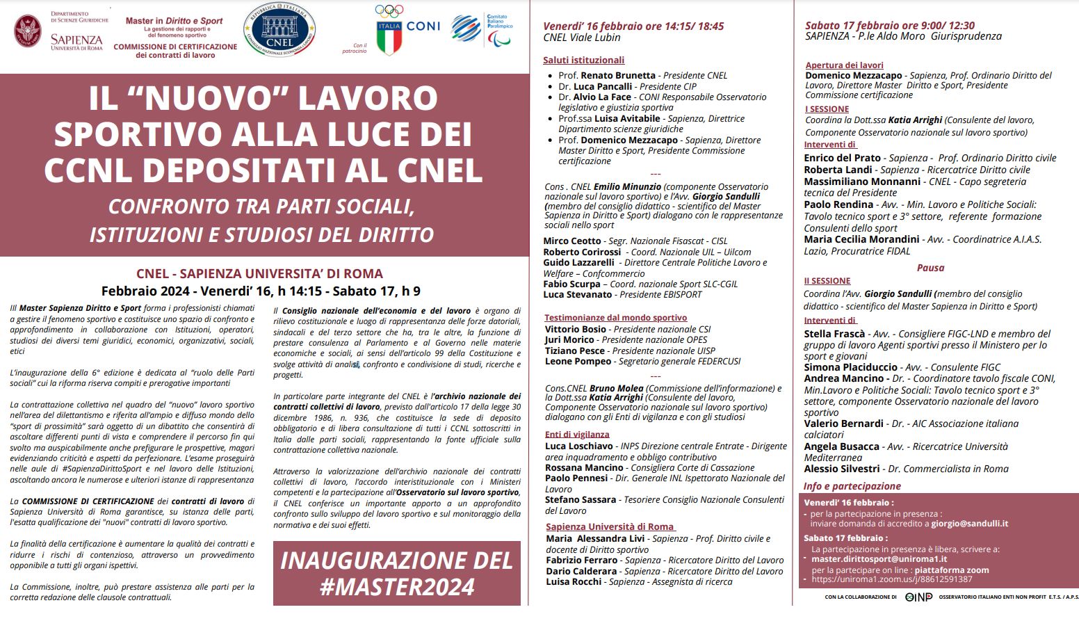Parte il 16 e 17 febbraio a Roma il Master in Diritto e Sport promosso dall’Università la Sapienza: il percorso di studio si aprirà on il seminario pubblico “Il ‘nuovo’ lavoro sportivo alla luce dei CCNL depositati al Cnel”, al quale prenderà parte anche AiCS, attraverso il suo presidente Bruno Molea, consigliere CNEL. Il seminario è infatti condotto in collaborazione con il Consiglio Nazionale dell’Economia e del Lavoro (CNEL) e avvia il percorso di approfondimento sulla funzione dei contratti nazionali di lavoro sportivo e sul ruolo delle Parti sociali nello sport.