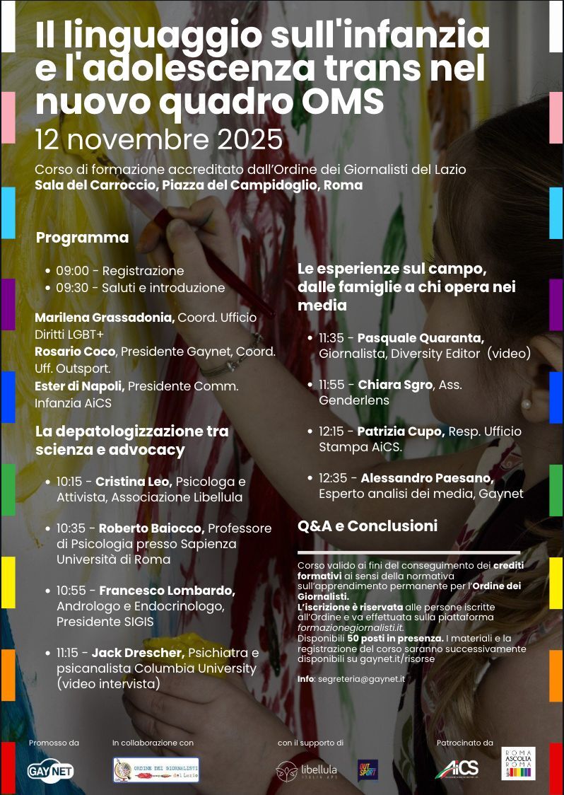Si terrà la mattina del 12 novembre a Roma, nella sala del Carroccio del Campidoglio, il corso di formazione accreditato dall’Ordine dei giornalisti del Lazio e dedicato al “Linguaggio sull’infanzia e l’adolescenza trans nel nuovo quadro OMS”. Il corso, promosso da GayNet, è patrocinato da AiCS che partecipa raccontando la sua esperienza nell’ambito del tesseramento Alias.