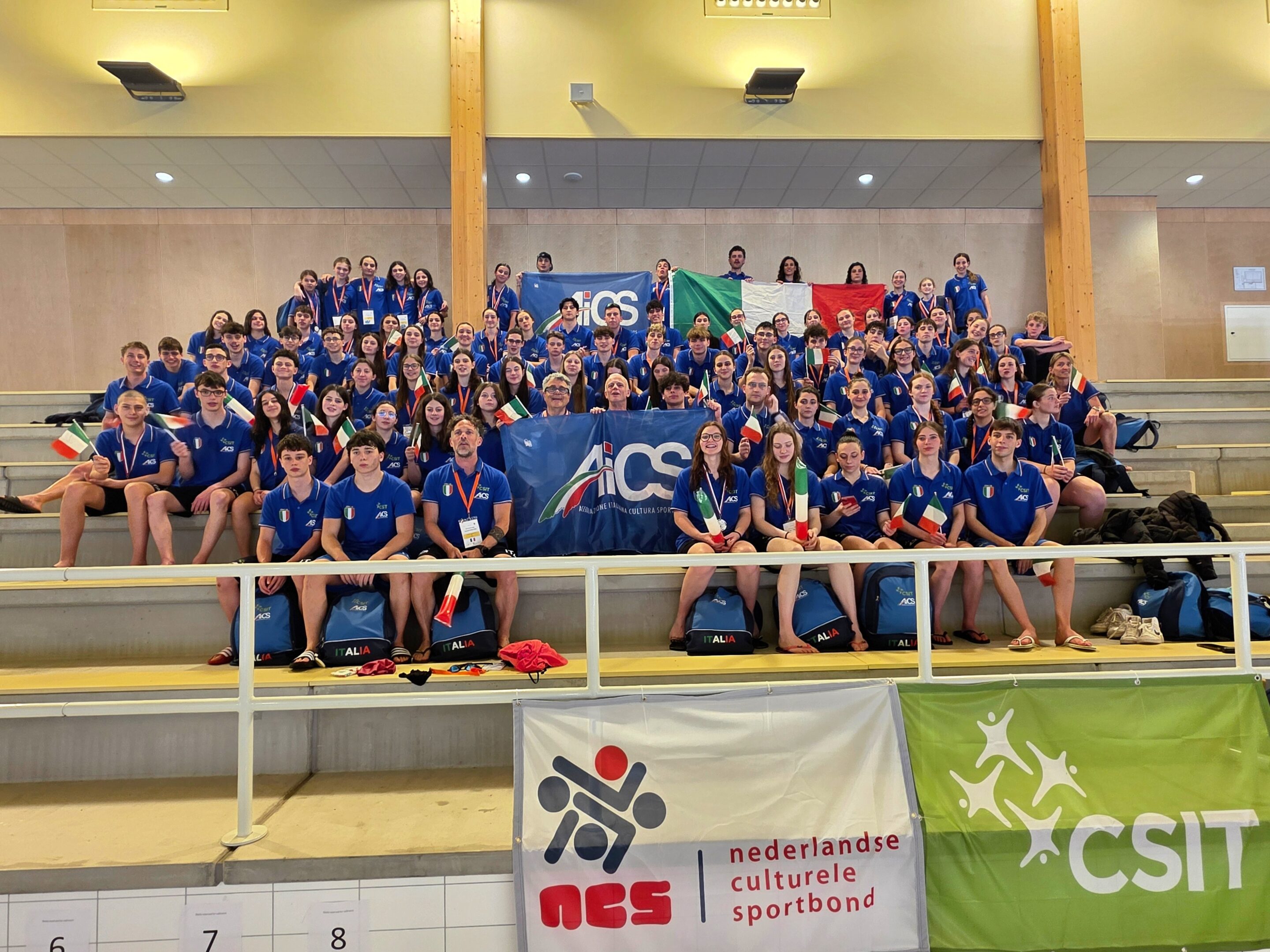 Ottimi segnali per l’Italia targata AiCS ai Campionati Internazionali di Nuoto CSIT 2026 – in corso dal 27 aprile al 1° maggio a Geleen, in Olanda – dove la rappresentativa azzurra si presenta con una delegazione numerosa e competitiva composta da 100 atleti. Le prime gare hanno già regalato grandi soddisfazioni, con le prime medaglie che iniziano ad arrivare per i colori italiani, confermando il valore e la crescita del movimento natatorio AiCS a livello internazionale.