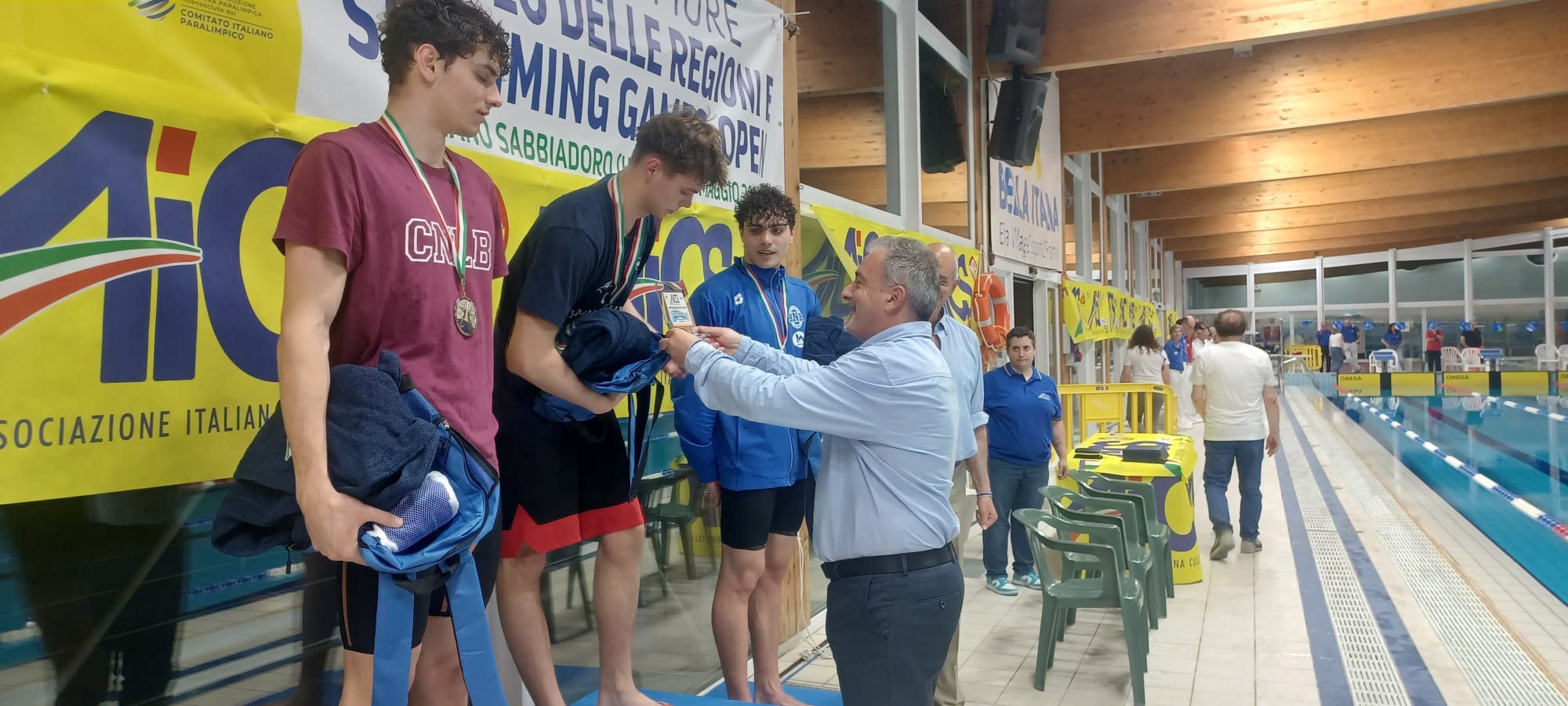 Si sono tenuti nel week end tra il 1° e il 4 maggio al Bella Italia Village di Lignano Sabbiadoro gli Swimming Games AiCS Open, il campionato nazionale di nuoto – anche paralimpico – di AiCS: oltre 700 gli atleti partecipanti che si sono cimentati in tutto in oltre 2mila gare. Cinque giorni di emozioni e volti che hanno gremito Lignano e portato a bordo vasca anche campioni del calibro di Antonio Fantin (nella foto, durante una premiazione, con il responsabile del dipartimento Sport Filippo Tiberia), recordman paralimpico di nuoto che ha voluto essere presente per portare il proprio saluto ai ragazzi e alle ragazze in vasca.