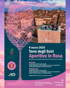 L’ associazione PRIORI e AiCS Perugia organizzano per la giornata dell’8 marzo “SPECIALE DONNA” – selezione di vini, stuzzichini, networking e socializzazione per l’APERITIVO IN ROSA, la mattina alle 11 :00 o il pomeriggio alle 16:00, in collaborazione con la strada dei vini del Cantico. PRENOTAZIONE OBBLIGATORIA tramite whatsapp +39 351 3531789 Vi aspettiamo sulla Torre degli Sciri per promuovere il rispetto.