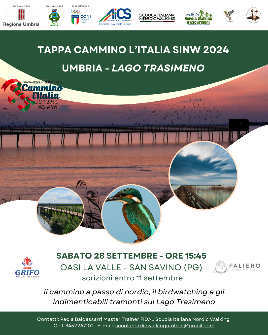 La TAPPA UMBRA proposta avrà luogo il 28 settembre sul LAGO TRASIMENO (PG) con partenza dal piccolo Borgo del Comune di Magione (PG) SAN SAVINO. Da lì si dirigerà verso l’OASI Naturalistica LA VALLE per una meravigliosa esperienza di birdwatching: ogni partecipante verrà dotato di binocolo con il quale potrà ammirare le numerosissime specie accompagnati da ornitologi dell’Oasi per rientrare in notturna sempre a passo di nordic walking ripercorrendo parte del percorso ciclabile con uso di torce frontali fino al punto di partenza.