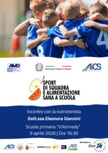 Nell’ambito del progetto “Sport di Squadra e Alimentazione Sana a Scuola“, si terrà il 9 aprile 2026 alle ore 16:30 presso la Scuola primaria V. Kennedy, un incontro con la nutrizionista Dott.ssa Eleonora Giannini della durata di 2 ore . La dottoressa Giannini, guiderà i partecipanti alla scoperta del binomio sport e salute con sana alimentazione, l’evento sarà aperto a tutti.