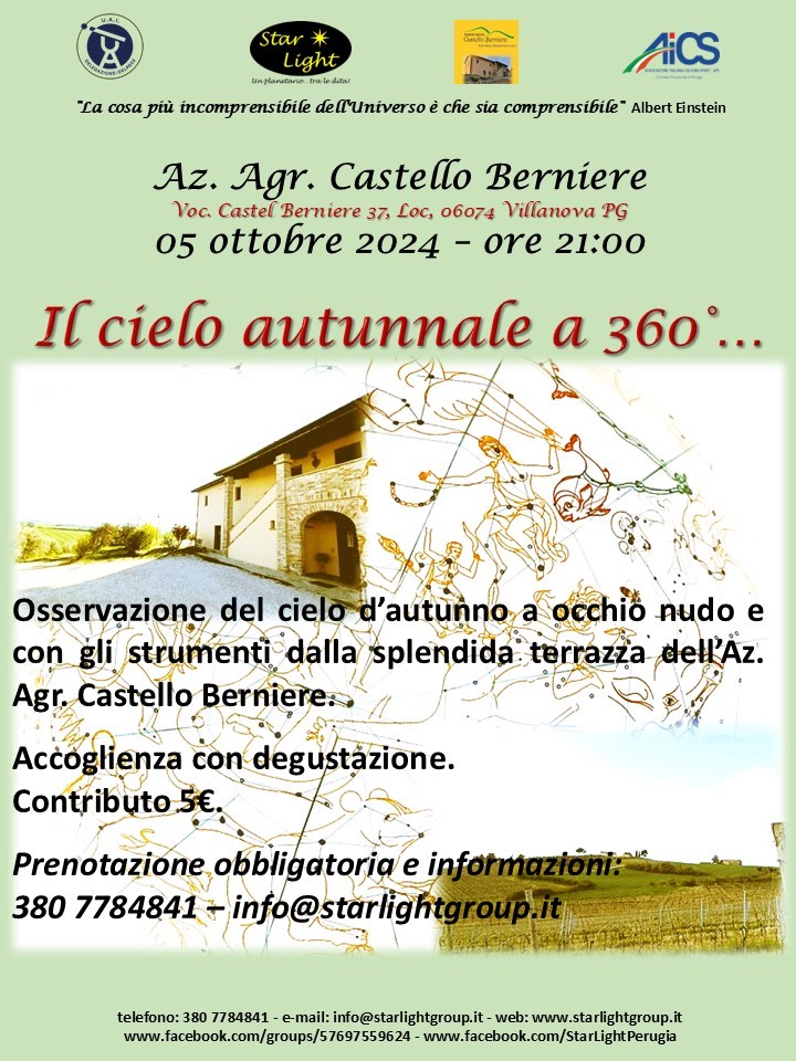 StarLight Un planetario Tra le dita organizza il 5 ottobre con la collaborazione di ACS Perugia una osservazione del cielo d’autunno a occhio nudo e con gli strumenti dalla splendida terrazza dell’Az. Agr. Castello Berniere. E’ una connessione tra il cielo e il mondo intero.