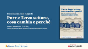 Il prossimo 12 settembre, presso la Sala del Cenacolo della Camera dei Deputati (Piazza in Campo Marzio 42, Roma), si svolgerà la presentazione del report “Pnrr e Terzo settore, cosa cambia e perché”, realizzato da Forum Terzo Settore e Fondazione Openpolis.