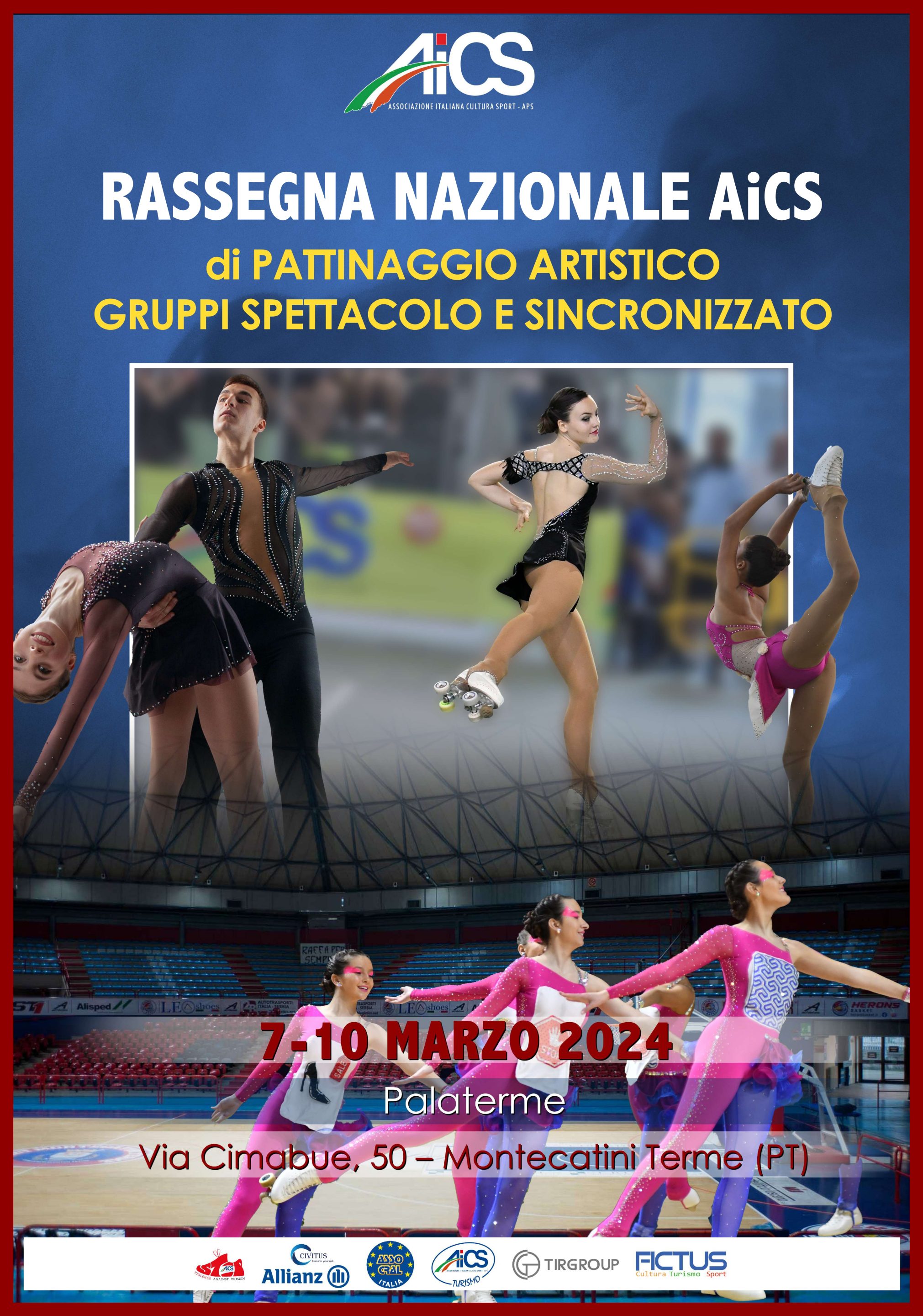 La Direzione Nazionale AICS, Dipartimento Sport, con l’approvazione del Settore Tecnico FISR, organizza a Montecatini Terme (PT), il 7-8-9-10 marzo 2024, presso l’impianto Palaterme di Montecatini (PI), Via Cimabue (pista parquet verniciato misure mt 25 x 50), la Rassegna Nazionale di Pattinaggio Artistico riservata ai Gruppi Spettacolo e Sincronizzato 2024. La manifestazione è realizzata in collaborazione con il Comitato Provinciale AICS di Pistoia, il Comitato Regionale AICS Toscana ed è patrocinata dal Comune di Montecatini Terme (PT).