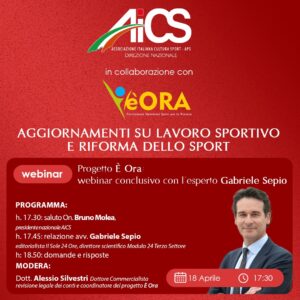In vista della conclusione della seconda edizione del progetto “E’ Ora! Servizi di aggiornamento e assistenza all’associazionismo sportivo per la ripartenza”, promosso da AiCS e finanziato da Sport e Salute, la direzione nazionale AiCS promuove per giovedì 18 aprile dalle ore 17.30 il webinar informativo sulle ultime novità previste dalla Riforma dello Sport e sulle ultime novità legislative, a cura dell’avvocato Gabriele Sepio, esperto tributarista, editorialista del Sole24Ore e direttore del Modulo Terzo Settore.