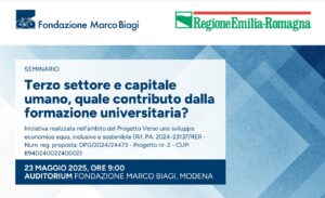 Venerdì 23 maggio 2025, dalle 9, si terrà in presenza all’Auditorium della Fondazione Marco Biagi il seminario dal titolo “Terzo settore e capitale umano, quale contributo dalla formazione universitaria?“, secondo incontro del ciclo di seminari organizzato dalla Fondazione universitaria “Marco Biagi” nell’ambito del progetto «Verso uno sviluppo economico equo, inclusivo e innovativo».