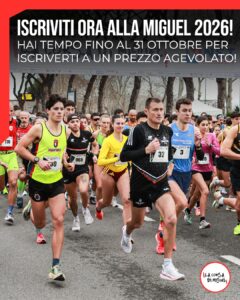 Le iscrizioni alla Corsa di Miguel 2026 sono finalmente aperte! Per la 10km competitiva e non competitiva troverete un prezzo agevolato fino al 31 ottobre 2025 e, per chi si iscriverà entro quella data, in omaggio anche il manicotto della Corsa di Miguel.