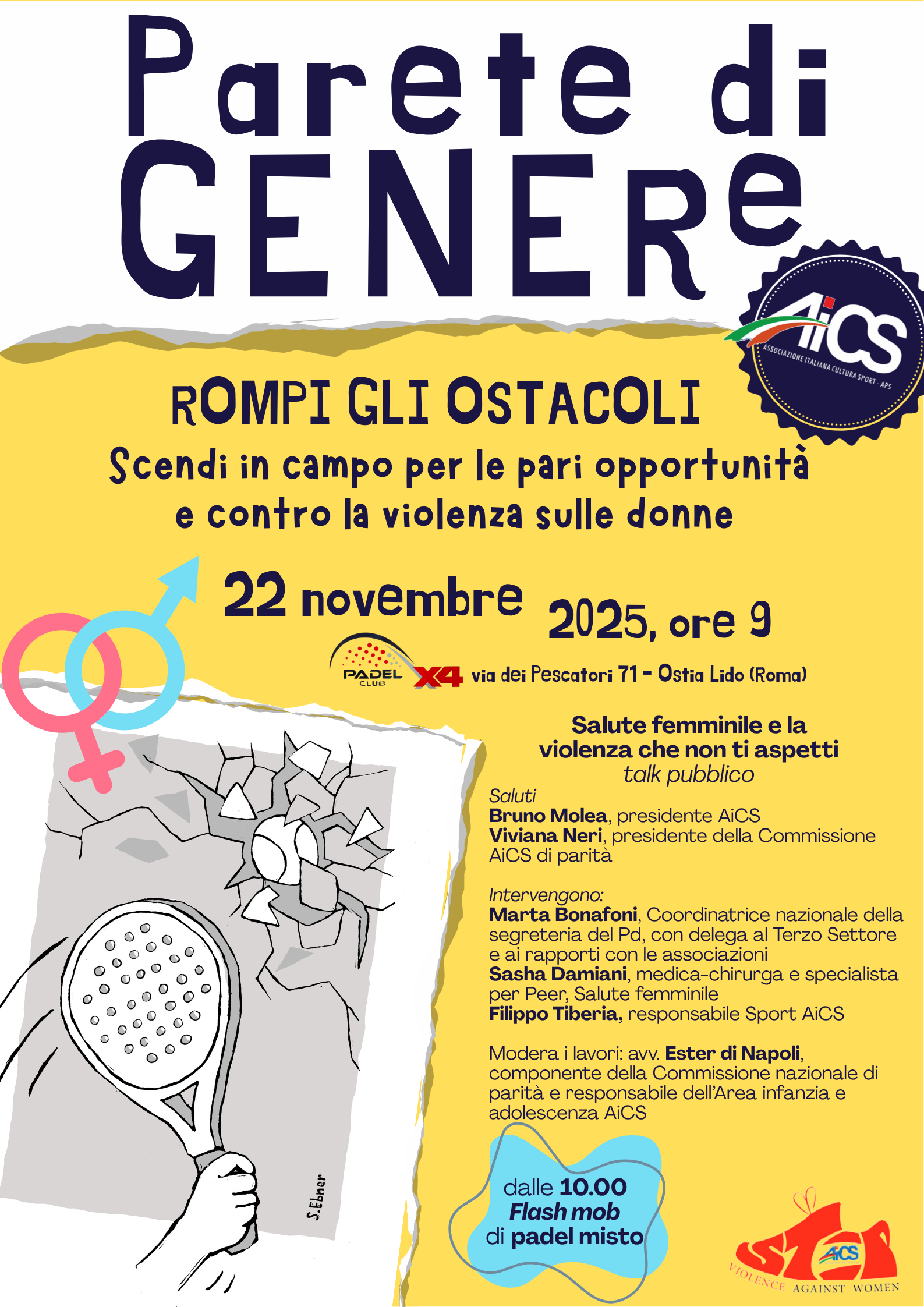 Oltre 1.100 gli atleti e le atlete amatoriali che si incontreranno in contemporanea sui camp di 50 circoli sportivi, sabato 22 novembre – nei giorni in cui il mondo ricorda la Giornata per la lotta alla violenza di genere – per una giornata di confronto e di festa. La battuta d’inizio sarà a Roma, dalle 10.00 al X4 Padel Club di Ostia (affiliato ad AiCS Roma), dove, prima del gioco – alle 9, si terrà il talk sulla salute femminile e sulla violenza ostetrica-ginecologica