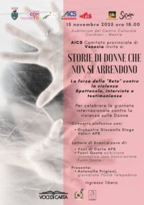 Il 15 novembre alle 18 nell’auditorium del centro culturale “Candiani” di Venezia torna “Storie di Donne che non si arrendono – La forza della RETE contro la violenza”, spettacolo promosso dalla Commissione di parità di AiCS Venezia, con il patrocinio della Presidenza del Consiglio del Comune di Venezia, e di AiCS Direzione nazionale. Lo spettacolo, giunto alla sua quarta edizione, è diretto da Patrizia Marras, presidente di AiCS Venezia.