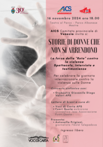 Torna il 16 novembre alle 18 nel Teatro al Parco di Mestre (Venezia), lo spettacolo “Storie di donne che non si arrendono – la forza delle donne contro la violenza” promosso da AiCS Venezia, con la regia di Patrizia Marras. La serata prevederà un concerto sinfonico, letture di brani estratti da pubblicazioni significative che faranno parlare le Donne, un’esibizione di Danza. A questo si aggiungeranno interviste e testimonianze dal Centro Antiviolenza del Comune di Venezia, dalle istituzioni presenti e da chi opera nel territorio.