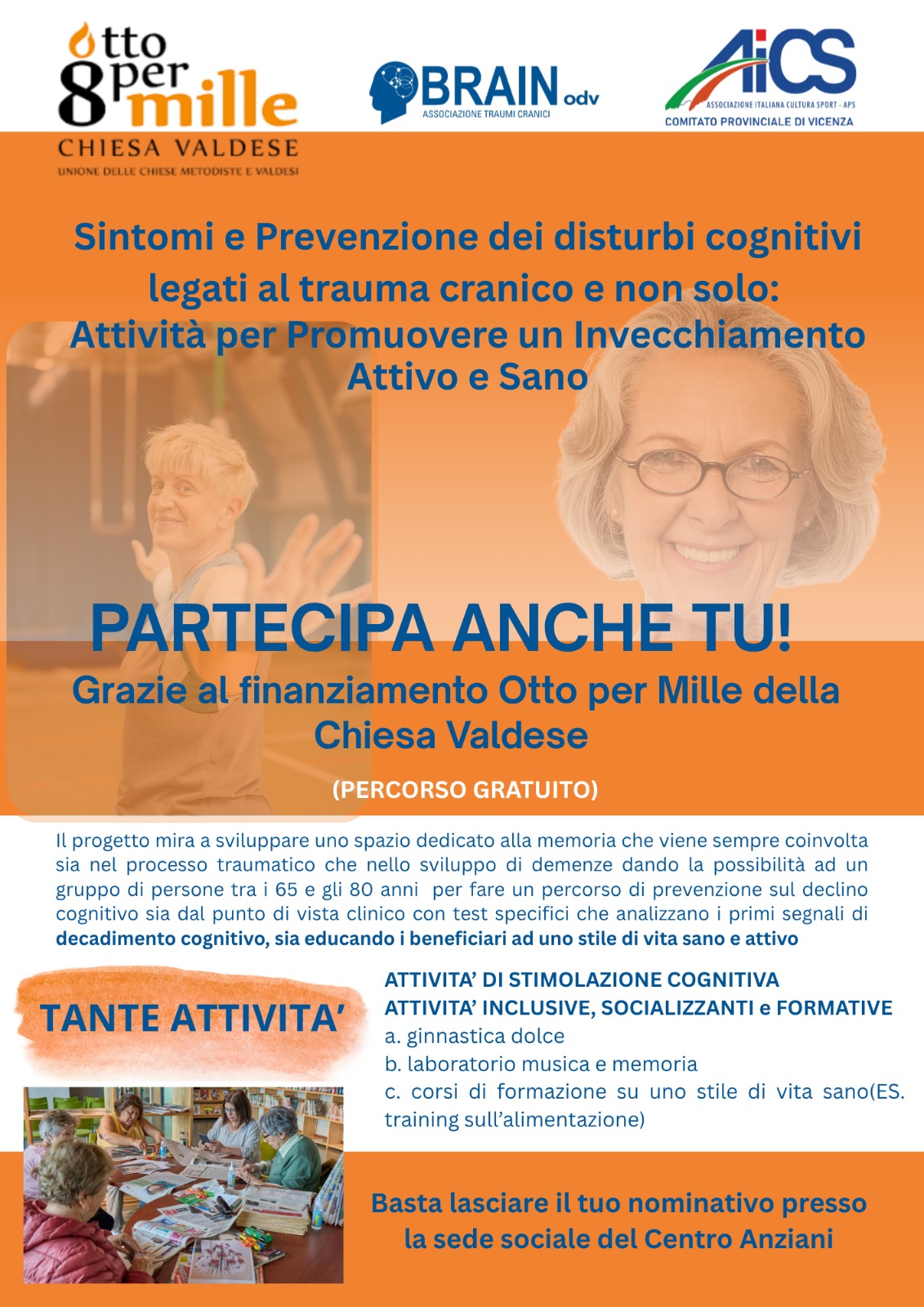 Ha preso il via, ad Altavilla Vicentina, un nuovo progetto promosso da Brain Associazione Traumi Cranici odv, in sinergia con il Gruppo Anziani Altavilla APS e con AICS Comitato Provinciale di Vicenza e sostenuto dall’Otto per Mille della Chiesa Valdese, che ha l’obiettivo di prevenire le demenze, promuovendo il benessere cognitivo, relazionale e psicofisico, a favore di un gruppo di anziani del territorio con esiti da cerebrolesioni e un altro gruppo di anziani comunque identificati come vulnerabili.